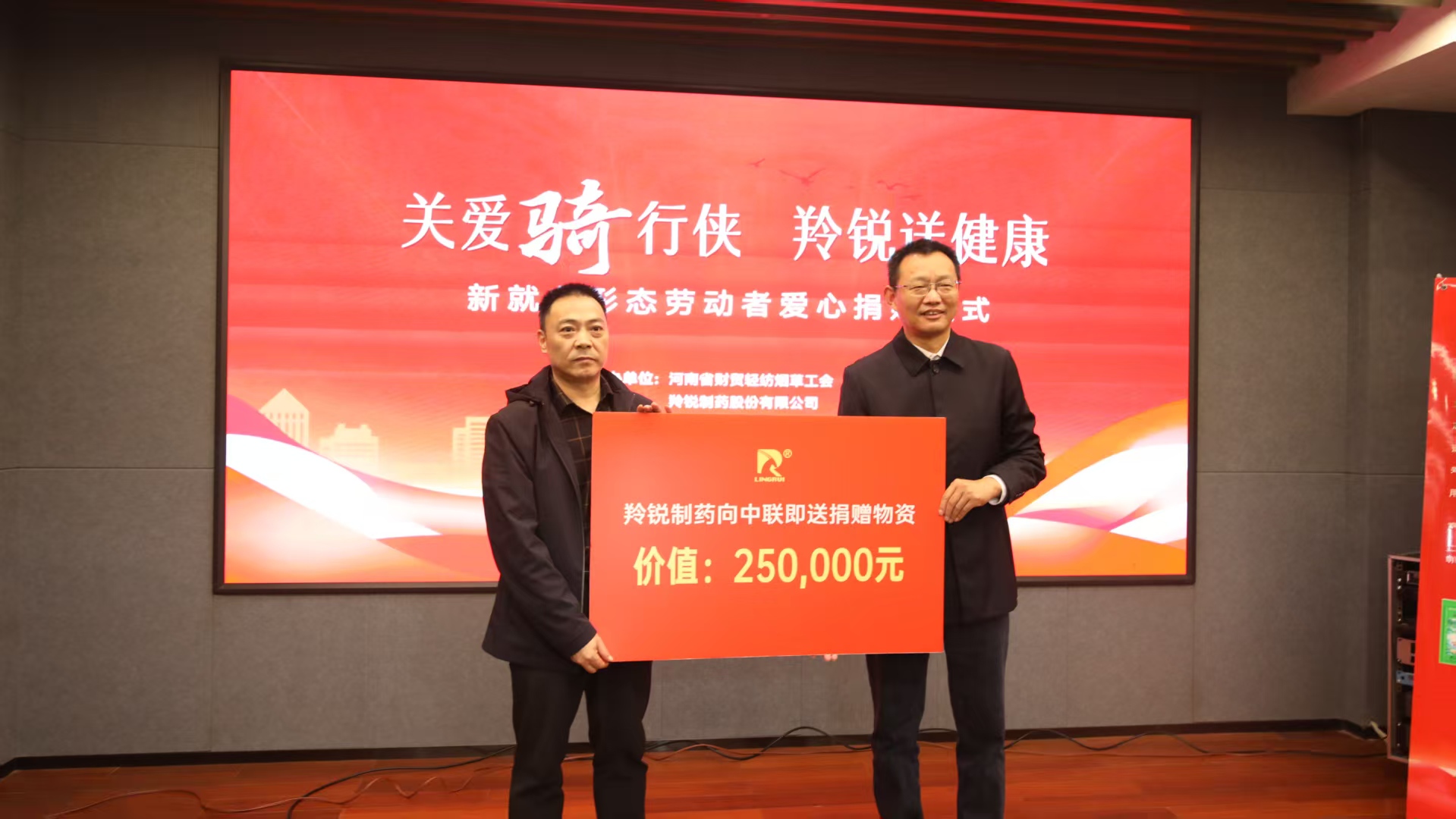 2025年11月9日,“關愛‘騎’行俠 羚銳送健康——新就業形態勞動者愛心捐贈儀式”在鄭州市溫情啟幕。此次活動由河南省財貿輕紡煙草工會、河南羚銳制藥股份有限公司、中聯即送網絡科技有限公司聯合主辦,河南省職工醫院提供支持,旨在為新就業形態勞動者送去健康關懷,讓戶外勞動者感受到社會各界的溫暖。